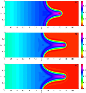 Figure 2 Comparison of r-adaptive moving mesh method (bottom panel) with a fixed uniform mesh (top and middle panel) scheme.