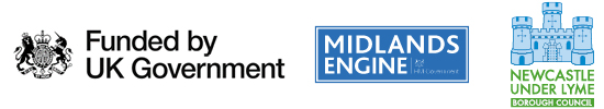 Logos for the UK Government, Midlands Engine and Newcastle-under-Lyme Borough Council